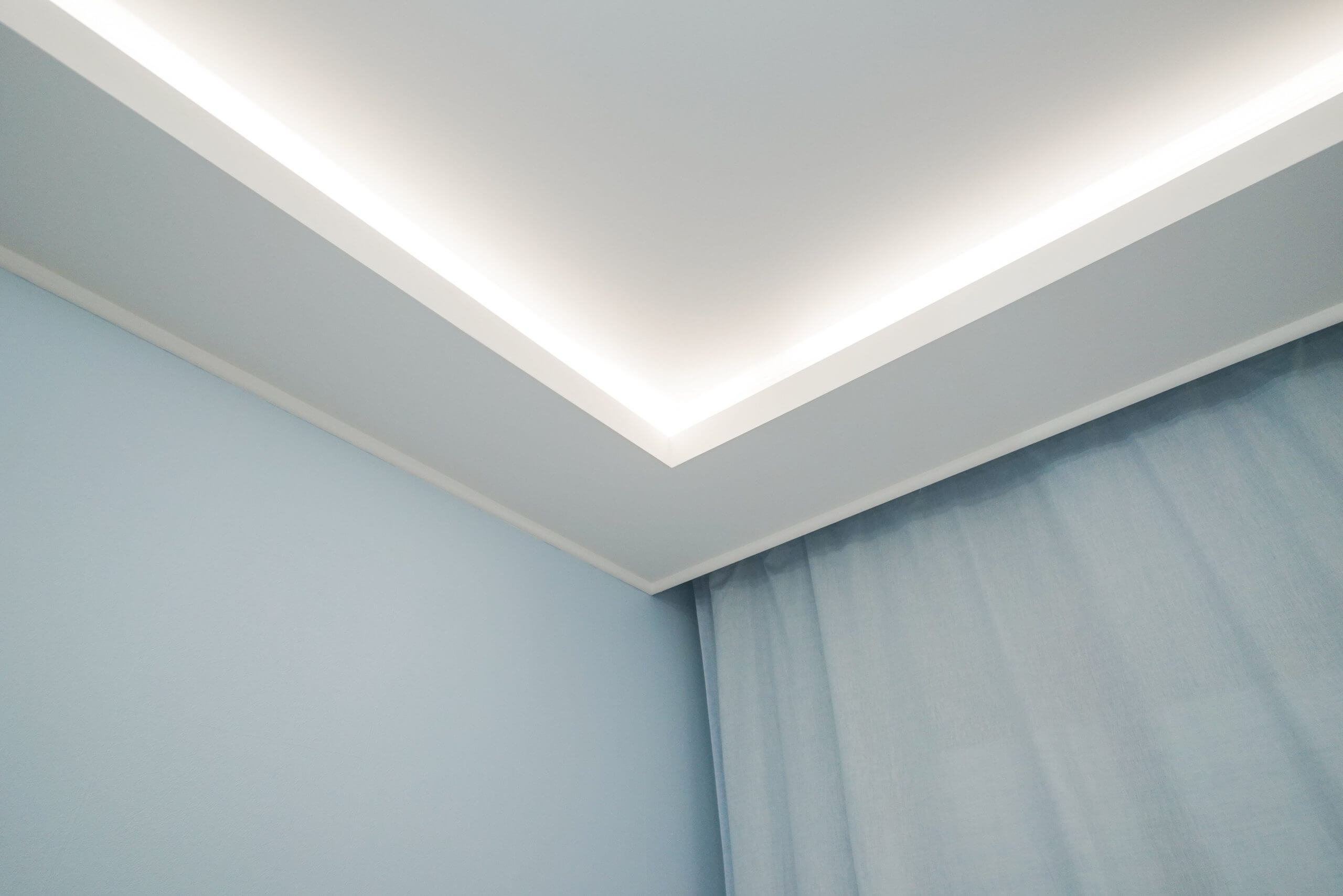 - Потолок натяжной со скрытыми карнизами.